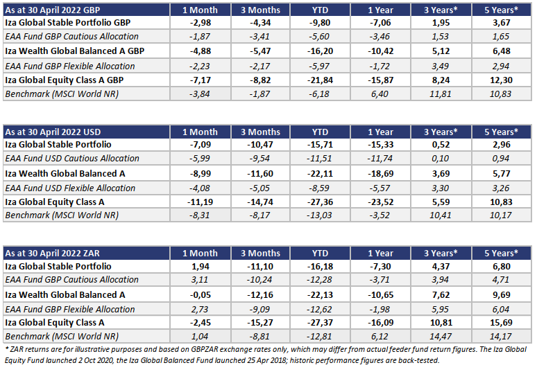 The Iza Global Equity Fund declined 7.2%, the Iza Global Balanced Fund by 4.9% and the Stable Model Portfolio by 3.0% (all GBP returns) for April.