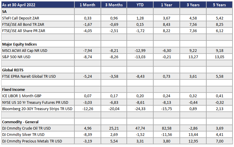 The South African equity market didn’t escape the global sell-off in April, with the FTSE/JSE All Share Index down 4.1% (ZAR terms). CPI continues to climb rising to 5.9% for March, from 5.7% in February, driven by the transport component of CPI. The reduction in the fuel price levy until the end of May will help mitigate this but does set the economy up for a larger hike in the June figure. Of concern is the potential for rising inflation to feed into wage adjustment expectations – especially in the government sector, given constrained government finances. Higher global and local interest rates will feed into the cost of borrowing for the government further exacerbating the issue. It is likely that at the SARB’s next Monetary Policy Committee meeting in May rates will be hiked by a further 0.5%. Flooding in KZN caused immeasurable human suffering and a death toll that stands at over 435. Latest estimates of the cost to repair the damage stands at ZAR 17bn, putting further pressure on government finances.