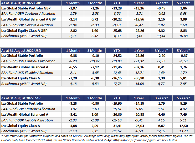The Iza Global Equity Fund declined by 2.82%, while the Iza Global Balanced Fund by 2.14% and the Stable Model Portfolio by 1.97% (all GBP returns) for August.