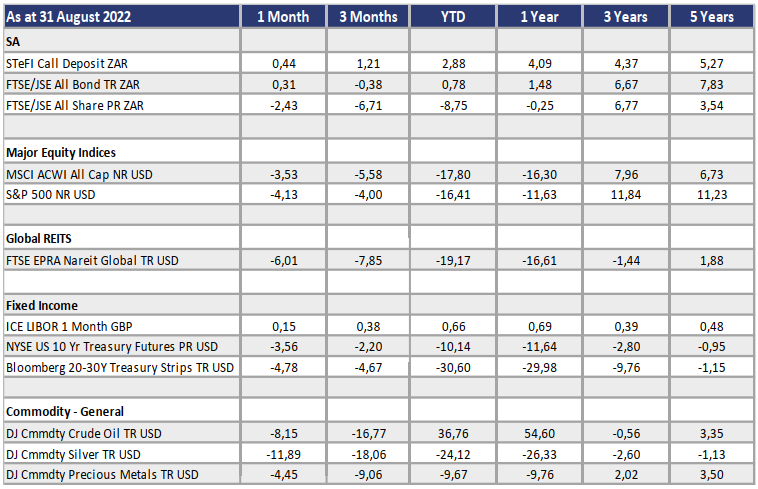 The South African stock market ended the month of August down -1.3% % following global peers lower this week after a selloff across all sectors. MTN and Old Mutual ended the month of August down -10.70% and -10.30% respectively. Massmart was August’s top performer 57% off the back of an announcement that Walmart is looking to buy up the remaining shares it does not already own. South African headline inflation increased to a 13-year high of 7.8% in July 2022 – remaining well above the upper limit of the SARB’s 3–6% target range. South Africa’s unemployment rate remains at elevated levels at 33.9% (2Q22) marginally down from the previous quarter. The rand weakened over the week to end at R17.28/$. The rand is likely to remain highly volatile, affected significantly by economic data and policy decisions in the US in particular, with the US possibly seeing the quickest economic recovery in 2023, although uncertainty levels are high currently. South Africa recorded a trade surplus of R24.8 billion in July, up from a surplus of R24.2 billion in June. Absa’s Purchasing Managers Index (PMI) rebounded in August after a dip in July. The index rose to 52.1 from 47.6 last month, beating estimates of 48.2. South Africa is pushing ahead with its plan to create a new state-owned power company. The proposed new company, called Generation 2, will be formed by converting three coal-fired plants, that were set for decommissioning, into gas-burning generators.