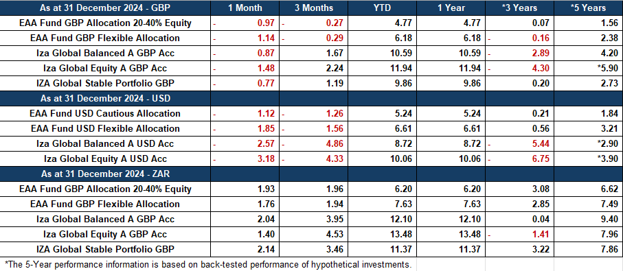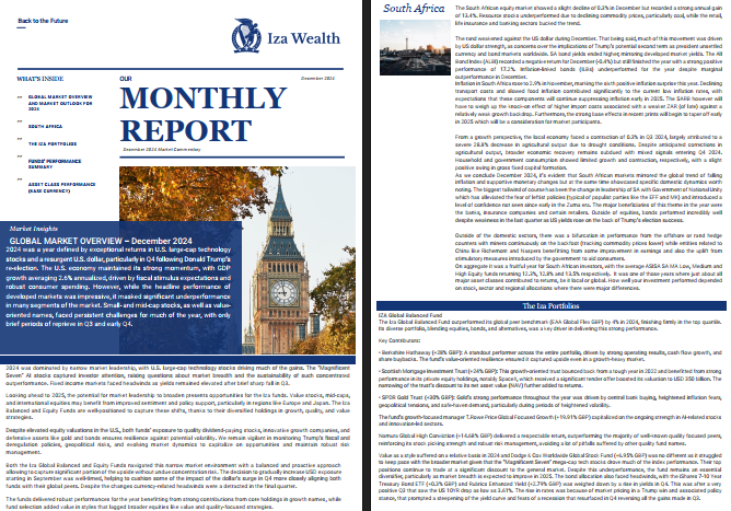 Looking ahead to 2025, the potential for market leadership to broaden presents opportunities for the Iza funds. Value stocks, mid-caps, and international equities may benefit from improved sentiment and policy support, particularly in regions like Europe and Japan. The Iza Balanced and Equity Funds are well-positioned to capture these shifts, thanks to their diversified holdings in growth, quality, and value strategies.