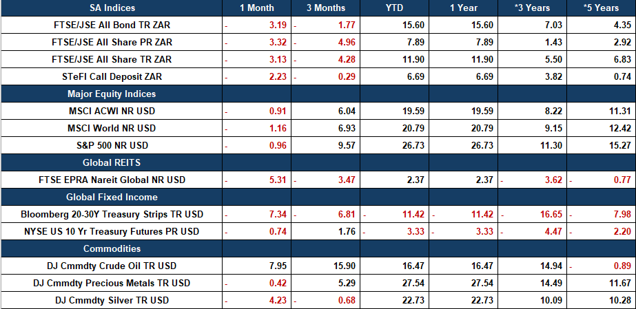 Outside of the domestic sectors, there was a bifurcation in performance from the offshore or rand hedge counters with miners continuously on the backfoot (tracking commodity prices lower) while entities related to China like Richemont and Naspers benefitting from some improvement in earnings and also the uplift from stimulatory measures introduced by the government to aid consumers.