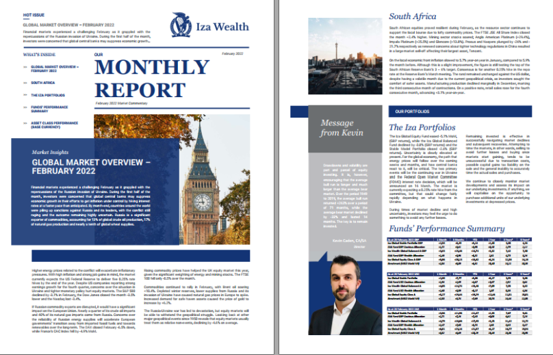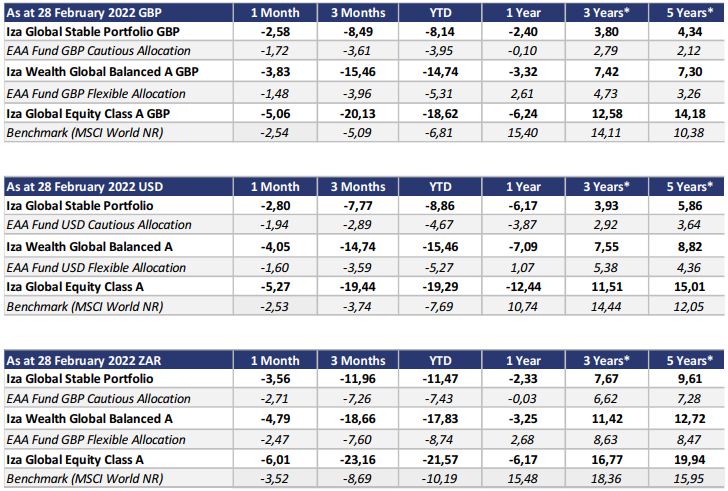 The Iza Global Equity Fund eased -5.1% MoM, (GBP returns), while the Iza Global Balanced Fund declined by -3.8% (GBP returns) and the Stable Model Portfolio closed -2.6% (GBP returns). Uncertainty is clearly elevated at present. For the global economy, the path that energy prices will follow over the coming weeks and months, and how central banks react to it, will be critical. The two primary events will be the continuing war in Ukraine and the Federal Open Market Committee (FOMC) interest rate decision, which will be announced on 16 March. The market is currently expecting a 0.25% rate hike from the committee, but that could change fairly rapidly depending on what happens in Ukraine.