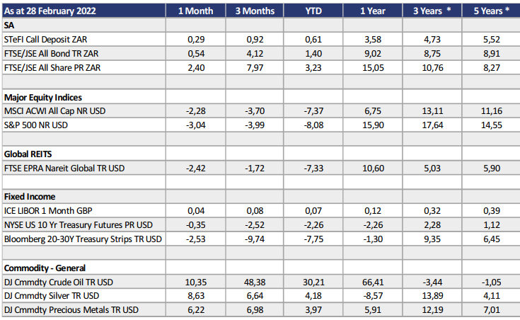 On the local economic front inflation slowed to 5.7% year-on year in January, compared to 5.9% the month before. Although this is a slight improvement, the figure is still testing the top of the South African Reserve Bank’s 3 – 6% target. Consensus is for another 0.25% hike in the repo rate at the Reserve Bank’s March meeting. The rand remained unchanged against the US dollar, despite having a volatile month due to the current geopolitical crisis, as investors sought the comfort of safer assets. Manufacturing production declined marginally in December, marking the third consecutive month of contractions. On a positive note, retail sales rose for the fourth consecutive month, advancing +3.1% year-on-year.