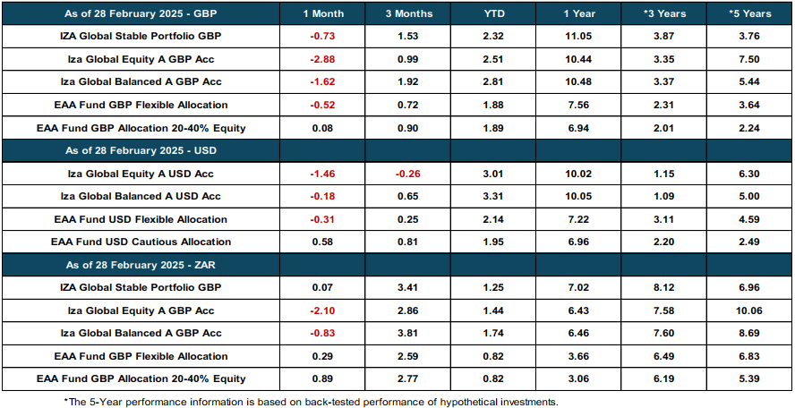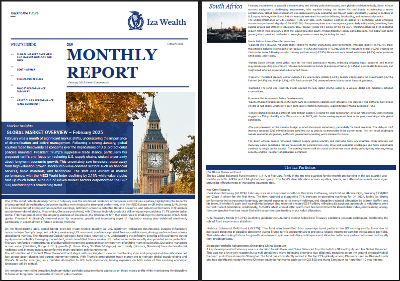 The Iza Global Balanced Fund returned -1.41% in February, firmly in the top two quartiles for the month and ranking in the top quartile yearto-date vs both ASISA and EAA global peer group. The fund’s diversification across equities, bonds, and alternative assets once again proved its effectiveness in managing downside risk.