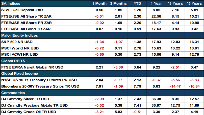 February was marked by geopolitical uncertainty and shifting policy landscapes, both globally and domestically. South African markets navigated a challenging environment, with equities ending the month flat and bonds experiencing a mixed performance. Global market sentiment was dampened by U.S. economic and foreign policy uncertainty, leading to declines in U.S. equity indices, while South African investors remained focused on inflation, fiscal policy, and monetary dynamics.