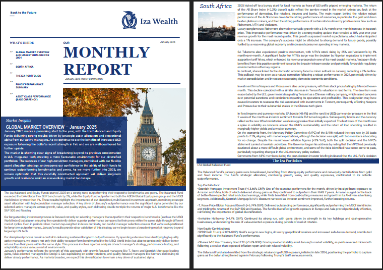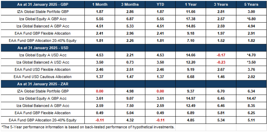 January 2025 marks a promising start to the year, with the Iza Balanced and Equity Funds delivering strong results driven by strategic asset allocation and exceptional alpha from our active managers. As we continue to see the benefits of increased USD exposure following the dollar’s recent strength in Feb and we are well-positioned for further upside.