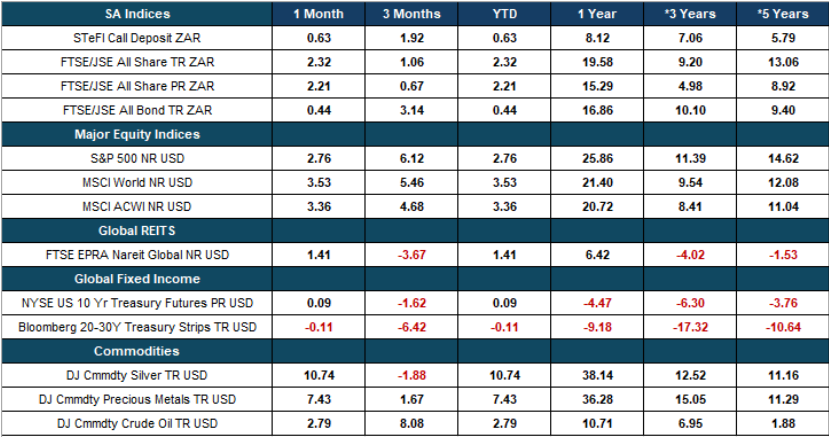 In fixed income and currency markets, SA bonds (+0.4%) and the rand (vs US$) came under pressure in the first 2 weeks of the month as investor sentiment towards EM turned negative. Subsequently bonds and the currency rallied as the new US administration was less aggressive than initially expected. The last week of the month saw a spike in volatility as concerns around the GNU’s sustainability and the return of load shedding resulted in marginally higher yields and a weaker currency.