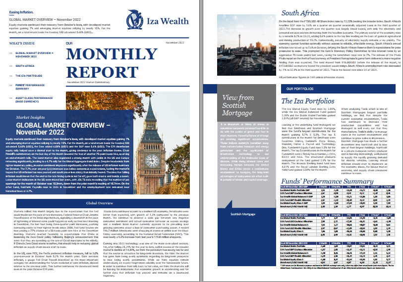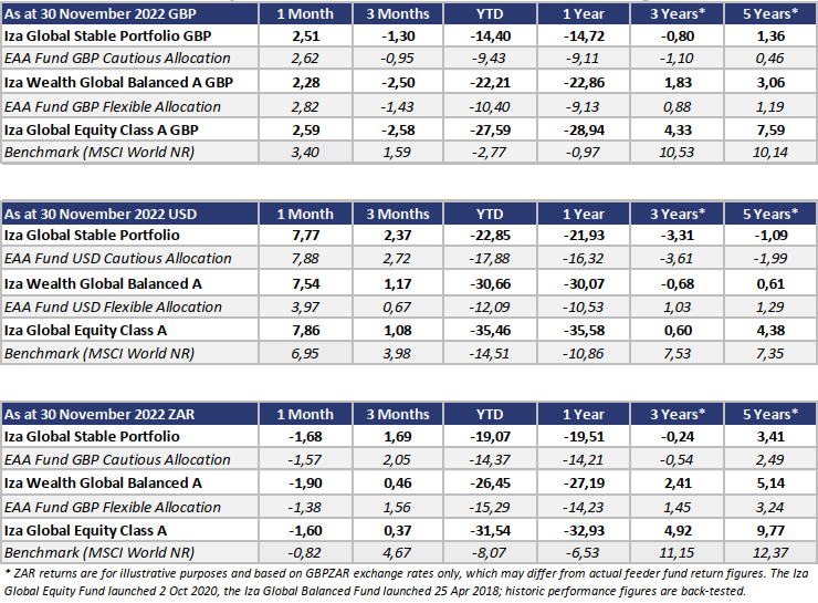 The Iza Global Equity Fund rose by 2.59%, while the Iza Global Balanced Fund gained 2.28% and the Stable Model Portfolio gained 2.51% (all GBP returns) for November.