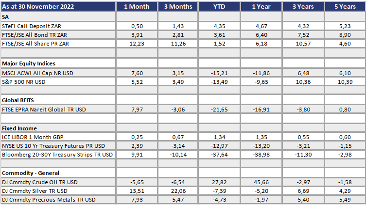 On the local front the FTSE/JSE All Share Index rose by 12.23% beating the broader index. South Africa’s headline GDP rose by 1.6% on a quarter on quarter seasonally adjusted basis in the third quarter of 2022.The increase in growth over the quarter was largely broad based, with only the electricity and personal services sectors detracting from the headline outcome. The primary sector of the economy rose by a notable 8.2% in Q3.22, adding 0.6% points to the top line reading on the back of gains in agricultural and mining production of 19.2%. Domestically, security of electricity supply remains a key priority. The economy cannot function optimally without access to reliable, affordable energy. South Africa’s annual inflation rate ticked up to 7.6% in October, defying the South African Reserve Bank’s expectations for price pressures to ease. This prompted the bank’s Monetary Policy Committee to hike interest rates by an aggressive 75 basis points last week, taking the benchmark repo rate to 7%. The release of the Phala Phala report on the theft of hard currency at President Ramaphosa’s game farm delivered a more negative finding than was expected. The rand moved from R16.80/USD before the release of the report, to R17.68/USD as markets feared the president would resign. South Africa’s unemployment rate decreased by -1% to 32.9% in the third quarter of 2022. This is the lowest rate since Q1 of 2021.