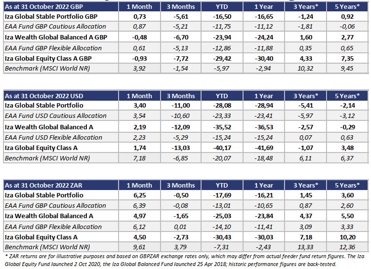 The Iza Global Equity Fund declined by -0.93%, while the Iza Global Balanced Fund declined by -0.48% and the Stable Model Portfolio gained 0.73% (all GBP returns) for October.