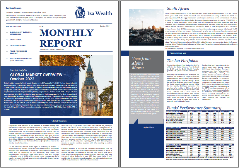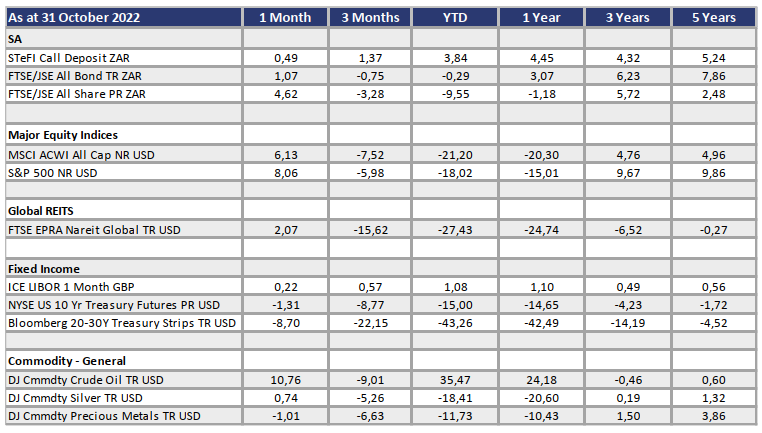 Local Equities rallied as the FTSE JSE All Share Index gained 4.6% in October and the FTSE JSE Capped SWIX gained 5.3% for the month. Financials were the top contributor adding 12.7% for the month and property gaining 9.4%. The biggest detractors were Naspers and Prosus as they both declined -16% during October. The Medium-Term Budget Policy Statement showed strong terms of trade for FY2022/2023 as a result of higher commodity prices, while signs of progress in addressing corruption also lifted sentiment. South African tax collections were 9% higher than the same period last year. South Africa’s annual inflation rate eased for the second consecutive month to 7.5% in September 2022. The South African Reserve Bank (SARB) remains concerned about increasing wage pressures. It looks as if the 7% wage increase at Eskom has become the benchmark for other pay settlements. Emerging markets such as South Africa have to respond to rate hikes in the US by making similar adjustments to their own rates, otherwise they face the risk of capital flight and a declining exchange rate. The Monetary Policy Committee (MPC) of the SARB is in the process of normalizing interest rates after the exceptionally low rates which prevailed during the pandemic. Members of the MPC indicate a normal repurchase rate is about 7%. South African miners lost c. R815m ($44 million) in export revenue per day during the Transnet workers’ strike. The institutional collapses of Eskom and Transnet are proving to be severe impediments to economic growth
