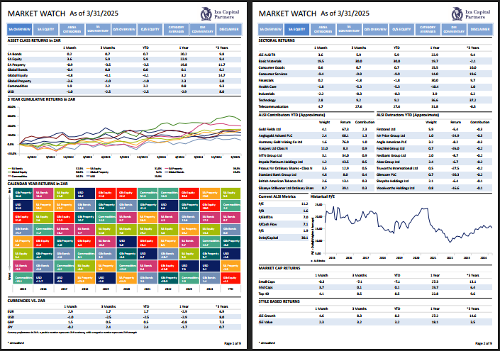 Gold miners delivered extraordinary returns, gaining 33% in March and 68% for the year to date, as the gold price surged past the US$3,000/oz level—a milestone that would have seemed ambitious just 18 months ago when the metal traded near US$1,800/oz. Platinum miners followed closely, posting gains of 40% in the month and 37% year to date. The rally was fuelled by a combination of geopolitical uncertainty, declining real yields, and sustained central bank buying—especially from emerging market central banks. Rhodium, a key PGM, also surged 21% in March, adding further tailwind to PGM-heavy portfolios. While precious metals supported the index-level gains, performance across other sectors was far less impressive. Many industrials and financials struggled to gain traction, a sign of lingering caution among investors amid concerns around growth, fiscal policy, and global risk appetite.